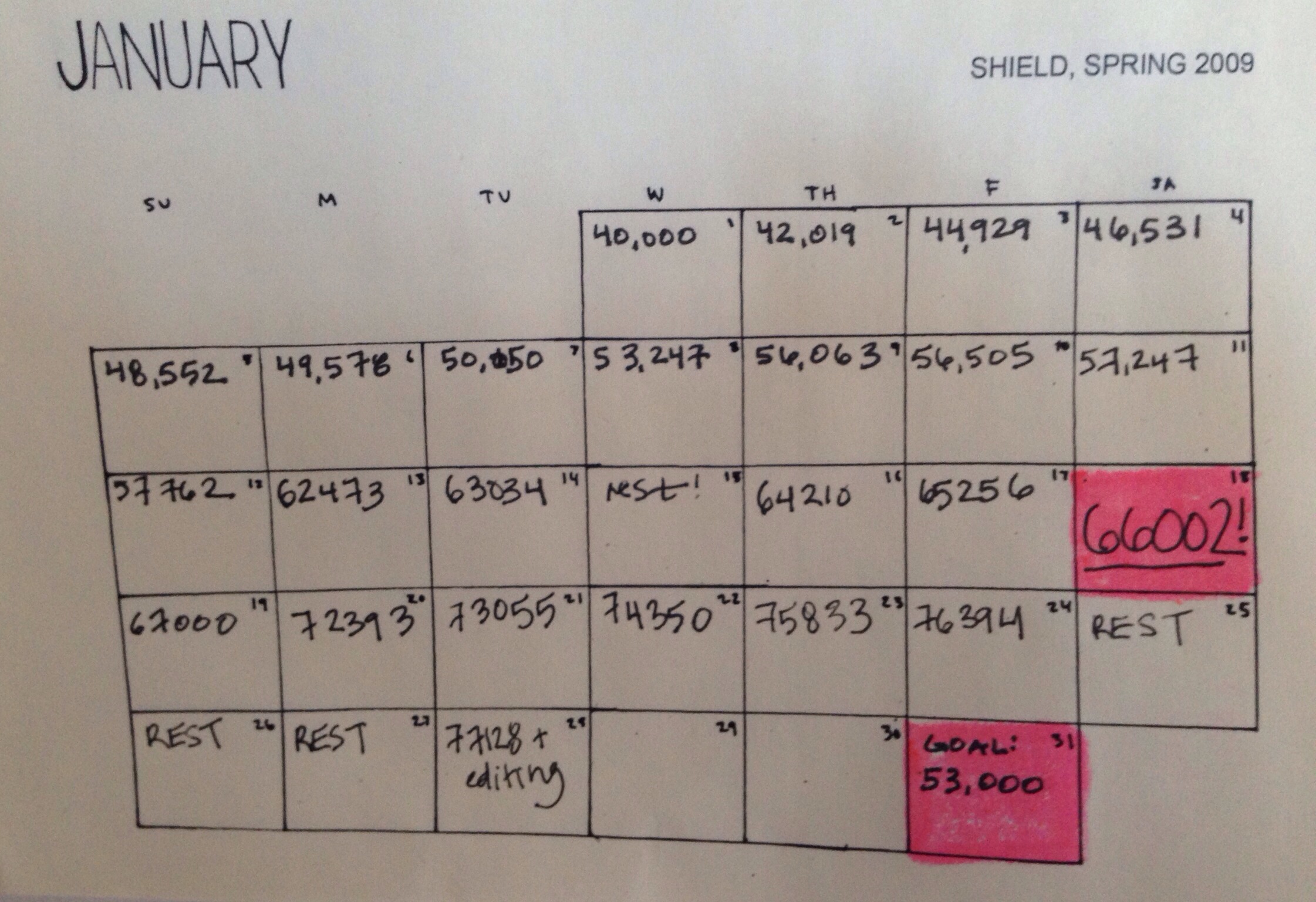 I contacted the instructor of the writing class that started this whole “I’m going to write a novel” craziness. She is not only a published author but also a professional manuscript editor. So the new goal is to get her my completed work by March 1st. This deadline feels more pressing than my noting the daily word count on a calendar. It means I’m taking the next step toward publishing my work.